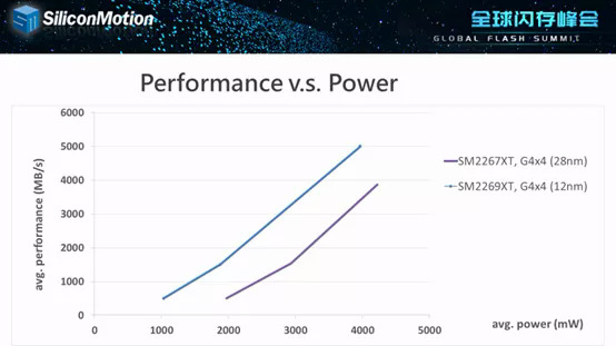 通过制程工艺的改进,12nm的PCIe Gen4 SM2269XT主控芯片在功耗和性能比方面更为出色。同为3000mW平均功耗,SM2269XT主控芯片拥有高达3500MB/s的性能,在达到4000mW平均功耗时,性能方面更是能够达到5000MB/s。
