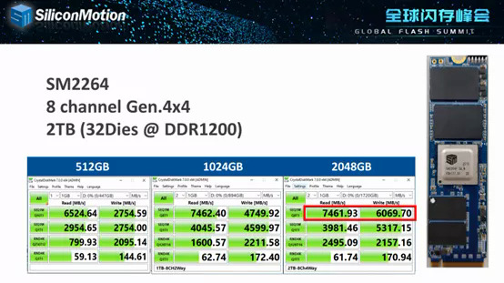 PCIe Gen4拥有更大的带宽,SSD的主控不仅要全新开发,NAND Flash和DRAM同样需要升级。实测样品搭载了慧荣科技SM2264主控芯片,拥有8个闪存通道,单颗闪存颗粒封装32个DDR1200 die,可轻松达到2TB容量。并且性能方面远超目前市售PCIe Gen4 SSD产品,连续读取速度可达7461MB/s,连续写入速度可达6069MB/s。