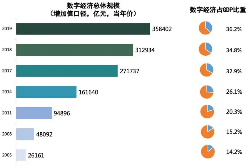 据中国信息通信研究院发布的《中国数字经济发展白皮书(2020年)》显示,2019年,我国数字经济增加值规模达到35.8万亿元,占GDP比重达到36.2%,占比同比提升1.4个百分点。中商产业研究院预测,2020年我国数字经济增加值规模将突破40万亿元大关,数字经济已经成为我国经济成长中不可或缺的推动力。