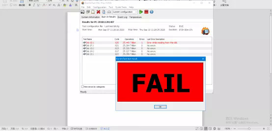 经过72小时的高低温循环后,PassMark BurnInTest的判定出现报错,根据结果来看,读取已创建的文件失败,可能由硬件错误或Windows的问题导致。