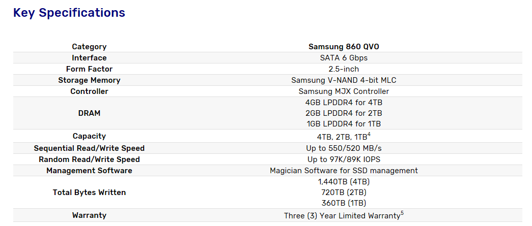 三星860 QVO SSD容量提供1TB、2TB、4TB选择,由于基于高密度的QLC(4bit)架构,使得TB容量的SSD价格更加亲民,也更容易让消费者接受,适合主流笔记本电脑或台式机性能提升,以提高日常处理大型/复杂/密集型任务的计算体验。