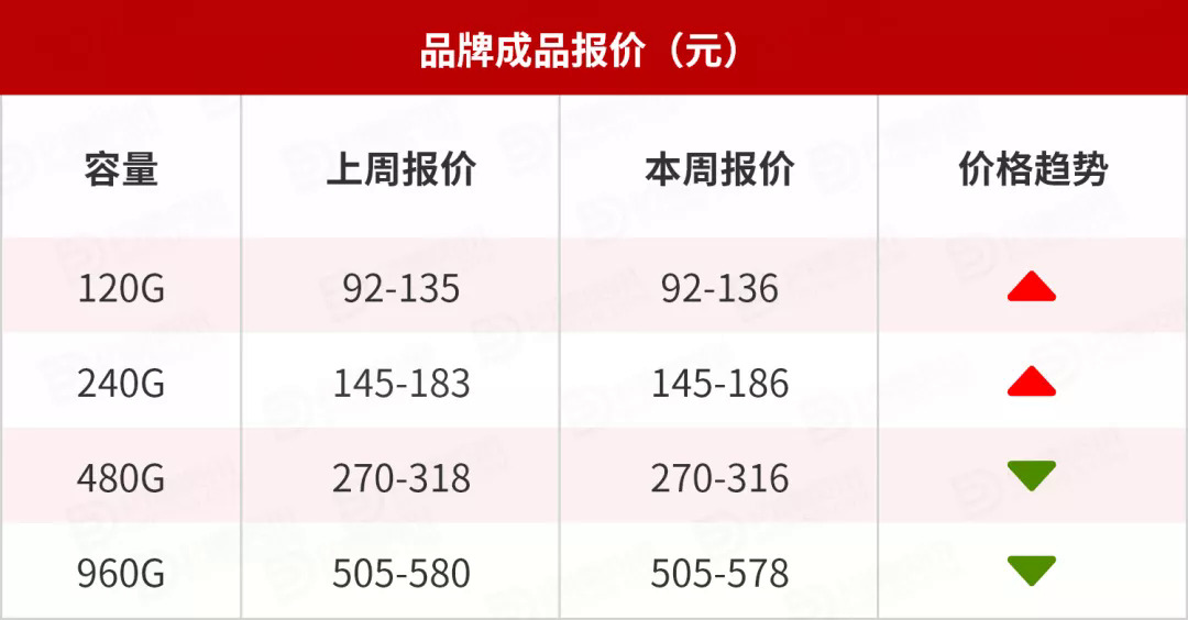 本周品牌大致报价,120G和240G容量报价呈现上涨趋势,涨幅在1-2%,480G和960G容量报价呈现下跌趋势,跌幅低于1%。