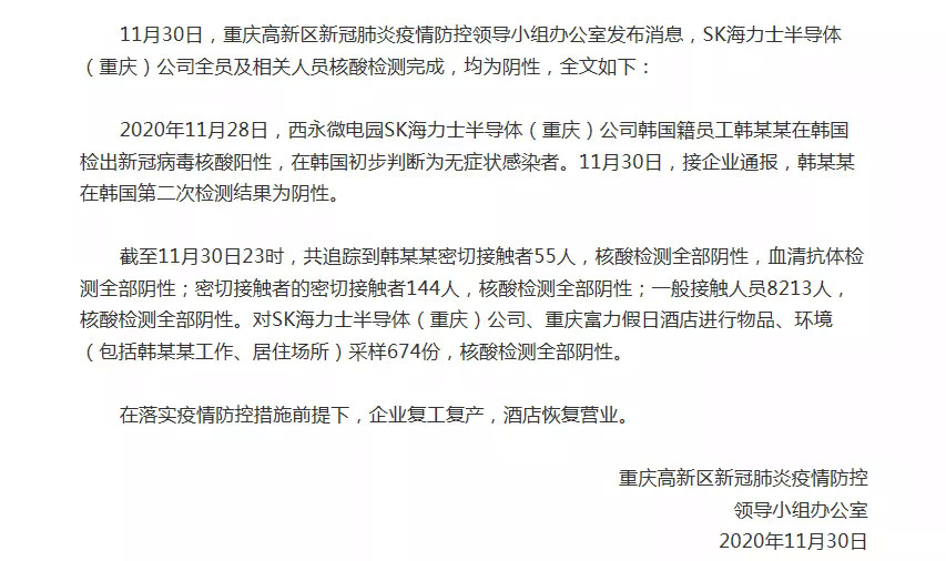 重庆高新区新冠肺炎疫情防控领导小组办公室发布消息称,SK海力士半导体(重庆)公司全员及相关人员核酸检测完成,均为阴性。