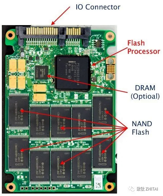 基于FLASH的SSD内部构造十分简单,其主体就是一块PCB,上面最基本的配件就是控制芯片,缓存芯片(有些SSD没有缓存芯片)以及FLASH芯片。