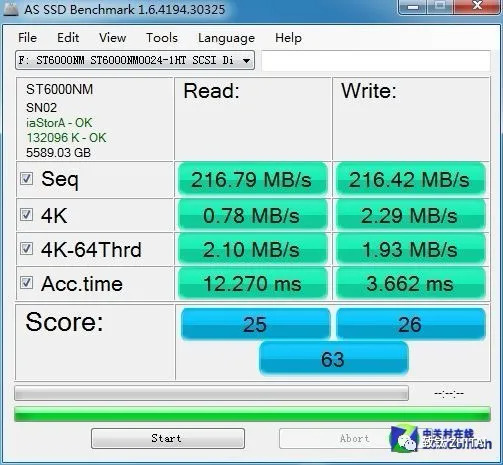 下图是希捷 6TB 硬盘ST6000NM0024 (7200转 128MB SATA3)的AS SSD Benchmark测试数据。