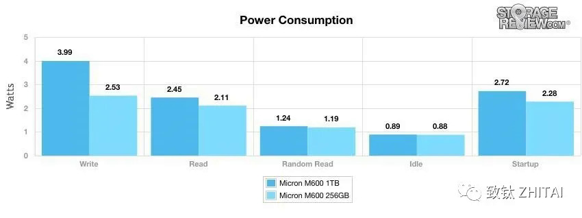 现在主流消费级HDD工作时功耗接近10W左右,空闲时功耗为5W左右。下面是Micron M600 SSD功耗,相比传统硬盘,SSD的功耗要低些。对便携式设备,如笔记本或者平板电脑,低功耗意味着更长的续航时间;对大型云存储设备,低功耗意味着更小的热量和更少的电费支出。