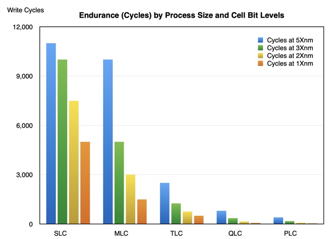 第三种选择是缩小NAND芯片上的物理单元尺寸,这意味着每个晶圆上的芯片数量更多。但是,一个单元可靠地存储重写值的能力,其在写周期方面的耐久性会随着过程大小以及单元位计数的增加而降低,以至于无法进一步发展。