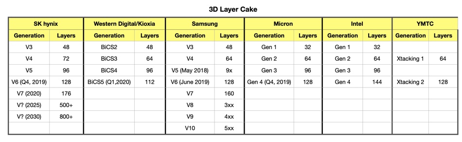 添加层会增加过程复杂性和处理时间。在64层上蚀刻一个孔比蚀刻一到96层要容易,并且随着层数增加到112、128、144等,难度再次增加。这意味着从晶片上获得好的管芯的良率可能会下降得很严重,蚀刻孔使管芯无效。产量下降意味着晶圆上每TB NAND的成本上升。