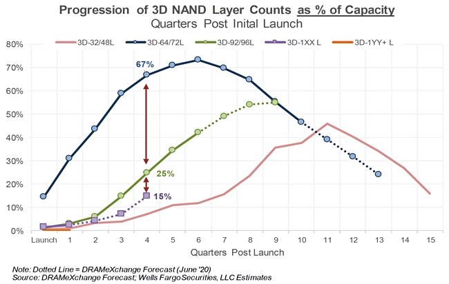 我们看到,与64 / 72L NAND相比,将96L NAND提升到行业出货量的70%需要更长的时间(按发布后的季度计算)。100层以上NAND的第一次迭代看起来可能还需要更长的时间。