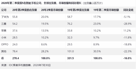 根据报告指出,全球智能手机出货量同比下降16.0%,与消费者支出有直接关系。由于全球经济危机和大量禁售导致失业率上升,消费者的消费欲望减少,导致智能手机的买气下降,出货量也是大幅减少,加上零售点的关闭,尤其是一些不流行线上购物的地区,加剧了对智能手机销售的负面影响,但消费者会购买例如PC、显示器、平板等来实现居家办公和远程学习,使智能手机的需求占比减少。