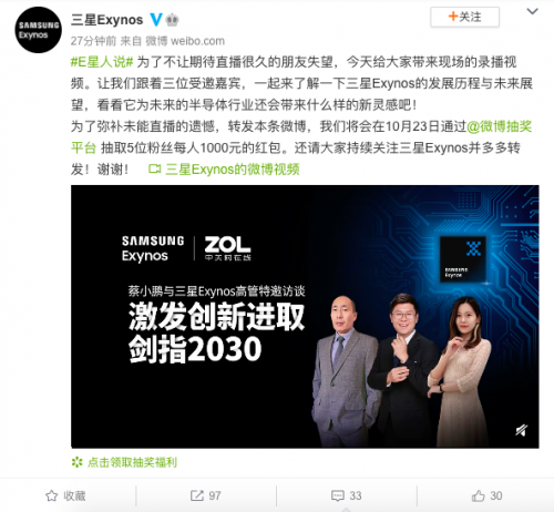 根据三星Exynos官方微博最新发布了主题为“激发创新进取 剑指2030”的视频,此次座谈会由三星电子系统LSI事业部携旗下移动芯片品牌三星Exynos发起。视频中三星半导体中国研究所所长潘学宝宣布,三星下半年将会发布拥有旗舰级性能的Exynos 1080芯片。毋庸置疑,该芯片自然就由明年初的全新三星Galaxy S21系列首发搭载。