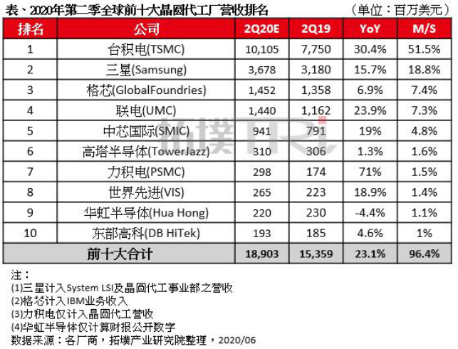 根据研究院公布的2020年二季度全球前十大晶圆代工厂商营收排行,台积电以101亿美元营收、51.5%市场份额荣获榜单第一名,远远甩开同榜单其他代工厂。