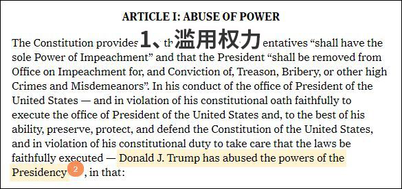“滥用权力”指特朗普通过向乌克兰施压,要求其调查拜登及其儿子,试图干预2020年总统选举,从而“获得不正当的个人利益,同时忽视或损害国家利益”。