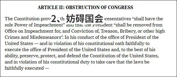 “妨碍国会”是指,“特朗普在被抓包、众议院启动弹劾调查时,对弹劾调查进行了空前的、无条件的、不分青红皂白的挑衅”(unprecedented categorical and indiscriminate defiance),从而阻碍了国会。