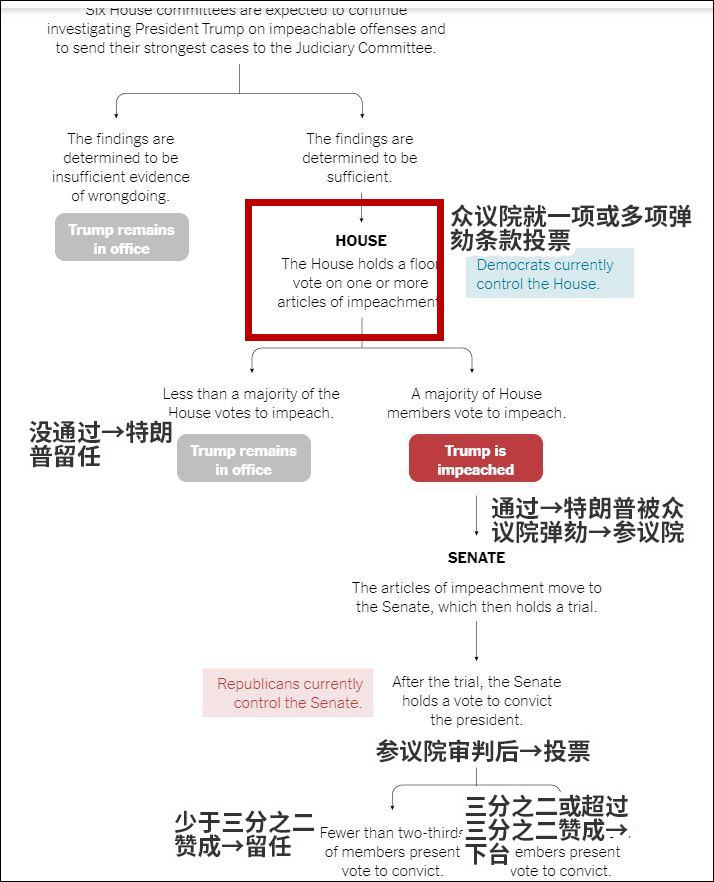 根据下图,众议院一旦起草完弹劾条款,就到了投票环节。如果众议院多数通过任何一项条款,决定权就将交到共和党控制的参议院手中。