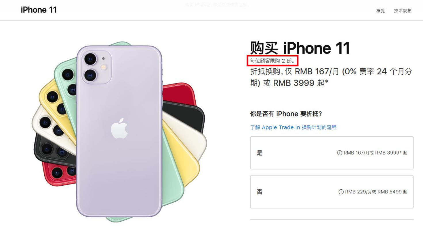 苹果对于用户购买部分iPhone机型新增了限购2部的规定,涉及机型包括iPhone11、iPhone 11Pro、iPhone 11 Pro Max、iPhone XR、iPhone 8 和iPhone 8Plus。
