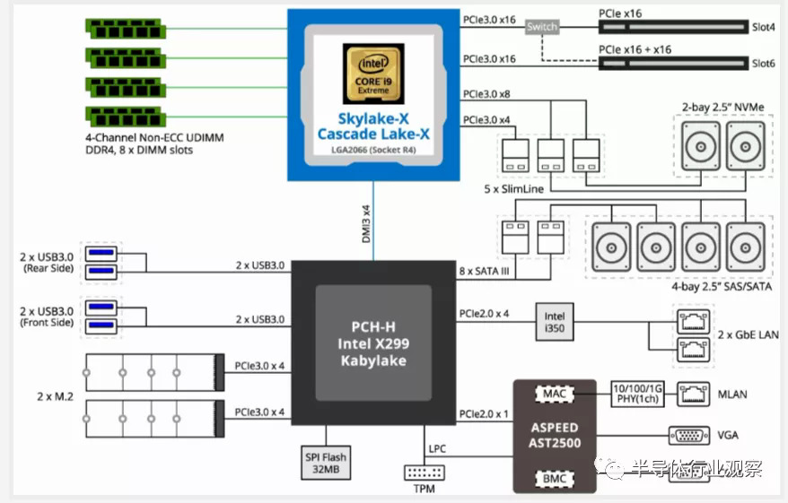 下图显示了Intel X299 Skylake-X系统中的各种设备如何相互通信: