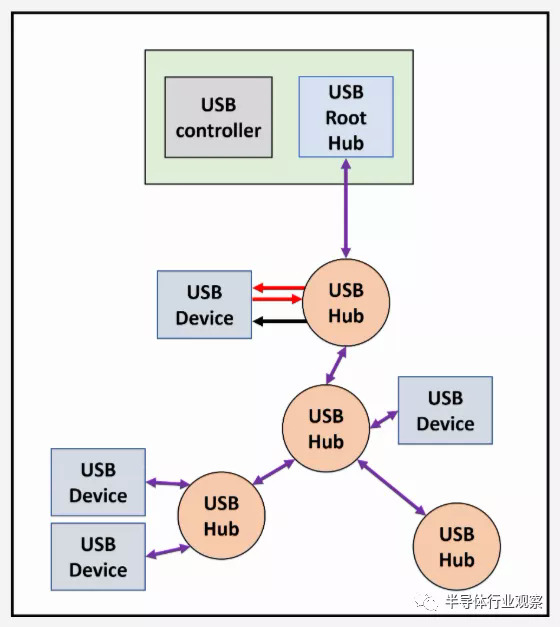 根集线器是将USB设备连接到计算机的主要阶段,但并非每个系统都以这种方式设置。有时,设备会连接到其他集线器,这些集线器又会以菊花链的方式回到USB主机(图像顶部的绿色框)。