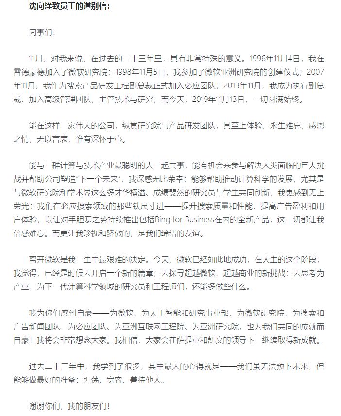 沈向洋在道别信中谈到:“离开微软是我一生中最艰难的决定。今天,微软已经如此地成功,在人生的这个阶段,我觉得,已经是时候去开启一个新的篇章;去探寻超越微软、超越商业的新挑战;去思考为产业、为下一代计算科学领域的研究员和工程师们,还能多做些什么。”