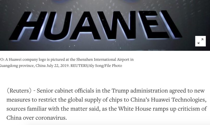 3月26日晚间,据路透社报道,知情人士指出,美国政府内阁高级官员同意采取新措施,限制全球向华为供应芯片,原因是白宫进一步将新型冠状病毒归咎于中国。