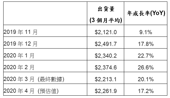 2019年11月至2020年4月北美半导体设备市场出货统计列表如下(单位:百万美元):