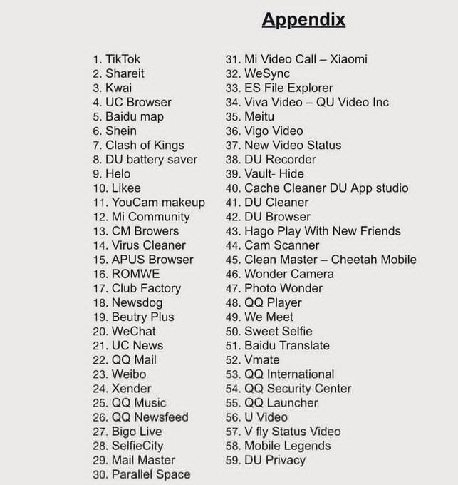 这是印度已禁止的59款中国应用的完整列表: