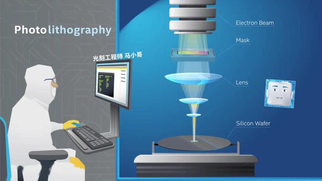 晶圆厂里同样有驻厂的光刻工程师马小哥。马小哥的工作是晶圆厂内制造流程的关键步骤,那就是让光源先穿透光罩、然后通过透镜把光线微缩后投射到晶圆表面。他们用不同的光罩重复进行这些操作,直到把芯片中所有的晶体管层和电路连接层全部制作完毕。