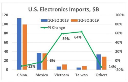 到目前为止,中国仍是美国最大的电子产品进口来源国,占其 2019 年前三季度的 54%。