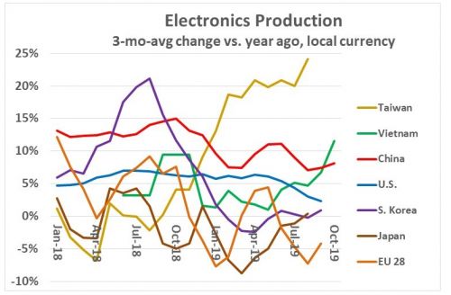 越南在 2019 年经历了电子产品的加速增长,其 10 月份产量增长达到 12%。在最近两年的大部分时间里,美国电子产品生产一直显示出 5%至 7%的温和增长,但在 9 月份下滑至 2%。