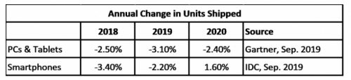 贸易争端对 2019 年整体电子业有何影响?答案是关键电子设备市场依然疲软。Gartner 预计,2019 年 PC 和平板电脑的总出货量将下降 3.1%,2020 年将下降 2.4%。