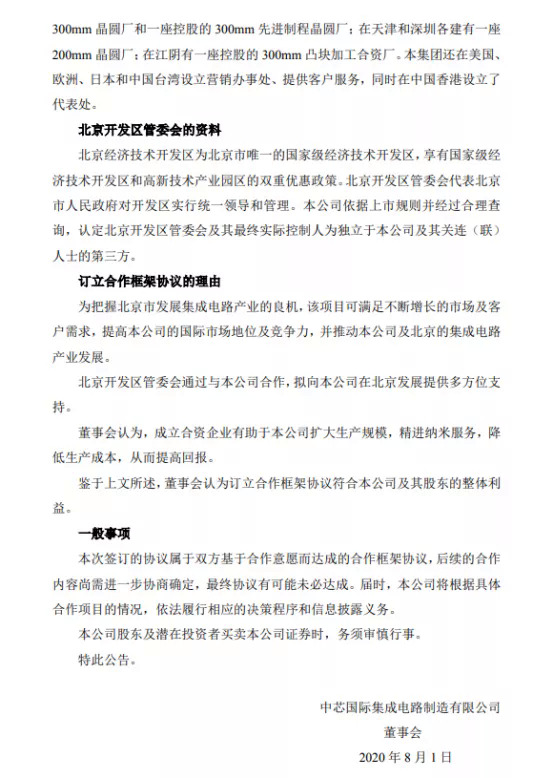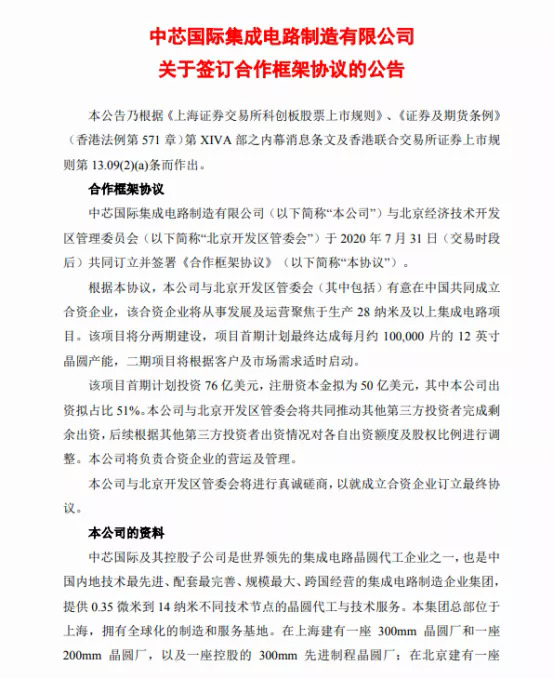 作为中国大陆最大的晶圆代工厂商,中芯国际在A股上市引起了巨大轰动,市值一度上涨到了7000亿。8月1日,中芯国际发布公告,公司与北京经济技术开发区管理委员会于7月31日共同订立并签署《合作框架协议》,双方将成立合资企业从事发展及运营聚焦于生产28nm及以上集成电路项目,项目首期计划投资76亿美元,至于本次与中芯国际合资的机构是谁,目前官方尚未公布。