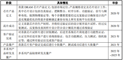 其中,兆易创新首款DRAM芯片产品定义,包括市场定位、产品规格设定及芯片设计工作,其中芯片设计包括仿真验证、逻辑整合、时序分析、功能验证、信号与频率布线、版图物理验证等,每个步骤都需要经过反复验证以确保设计的产品实现最优化的性能并能够满足兼容市场上所有系统平台的需求;定义首款芯片的生产制程,并将经过验证后的设计展开流片试样,经过反复测试、反复修改直到样片设计符合设计规范并通过系统验证,实施时间预计在2020年;对首款芯片试样片进行封装测试,后送至系统芯片商处进行功能性认证,认证完毕后送至客户进行系统级验证,包含功能测试、压力测试、烧机验证等,通过所有验证后完成客户验证,验证完成后进行小批量产,实施时间预计在2021年。