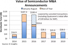 沉寂几年后崛地而起?今年半导体并购活动不断增加 据IC Insights报告显示,2019年前8个月半导体收购协议价值超过了2018年全年总和(259亿美元),直逼2017年。