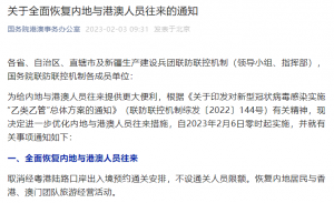 2月6日起,全面恢复内地与港澳人员往来 2月3日,国务院联防联控机制综合组发布《关于全面恢复内地与港澳人员往来的通知》。