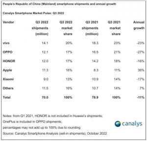 国内市场Q3手机出货年减超1成,苹果继续逆势增长 据研调机构Canalys 27日发布报告,因经济放缓打击消费者需求,第三季中国智能手机出货量年减11%,主要国产品牌均呈双位数下滑,仅苹果逆势成长,出货年增率将近四成。