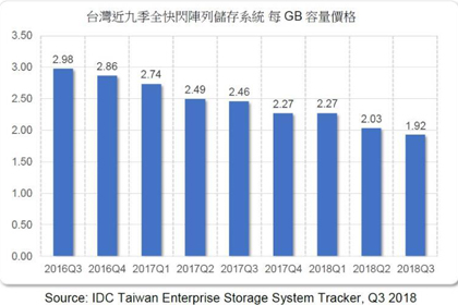 全快闪阵列 Q3每GB跌破2美元 根据市调机构调查报告显示,2018年第三季全快闪阵列(All-Flash Array,AFA)储存系统的每GB容量价格首度跌破2美元大关,来到1.92美元价位。IDC预期,价格的下跌将加强企业采用AFA动机,只要NAND Flash制程技术持续突破,相同成本的容量增加速度,高过于企业资料需求的增长速度,则NAND Flash在企业储存系统市场渗透率将持续提升。