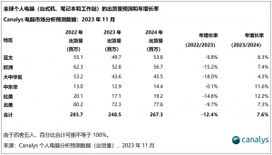 机构:2024年全球PC出货量将增长8%,达到2.67亿台 在近期节日旺季以及宏观经济改善的推动下,预计2023年第四季度市场将增长5%。展望未来,2024年全年出货量预计将增长8%,达到2.67亿台