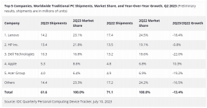 机构:全球PC出货量连6季萎缩,Q2初估年减13% 据市调机构IDC近日公布显示,2023年第二季(Q2)全球传统个人电脑(PC)出货量初估年减13.4% ,连六季萎缩。