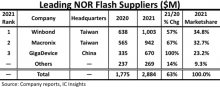 据研调机构IC Insights统计,去年编码型闪存(NOR Flash)营收约29亿美元,成长63%,预期今年可望进一步攀高至35亿美元,将再成长21%。